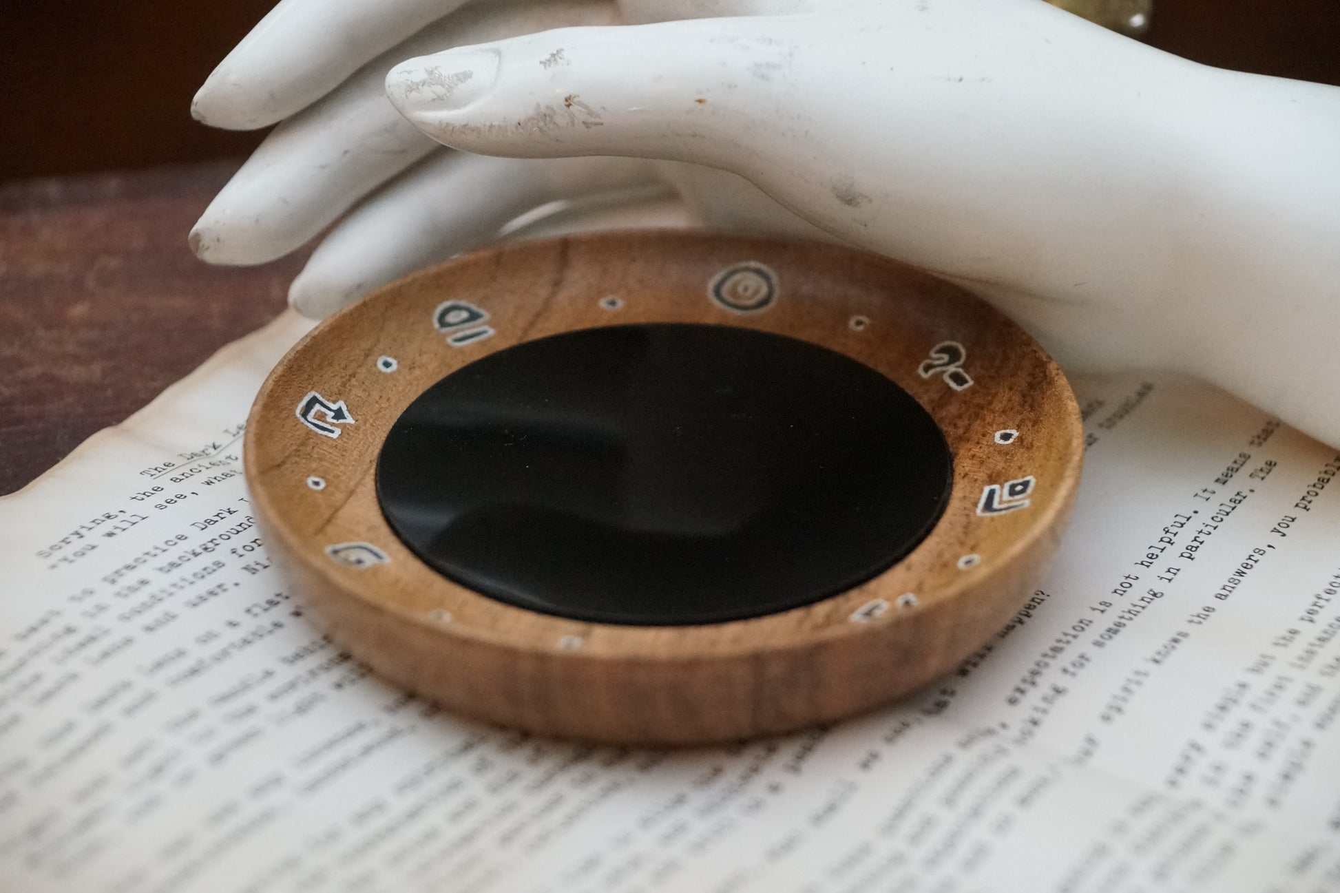 The Dark Lens is a solid acacia wooden circle with a dark reflective lens fixed centrally and metal feet on the base. The wooden surface is worn and aged, with mysterious symbols inked onto the black frame.