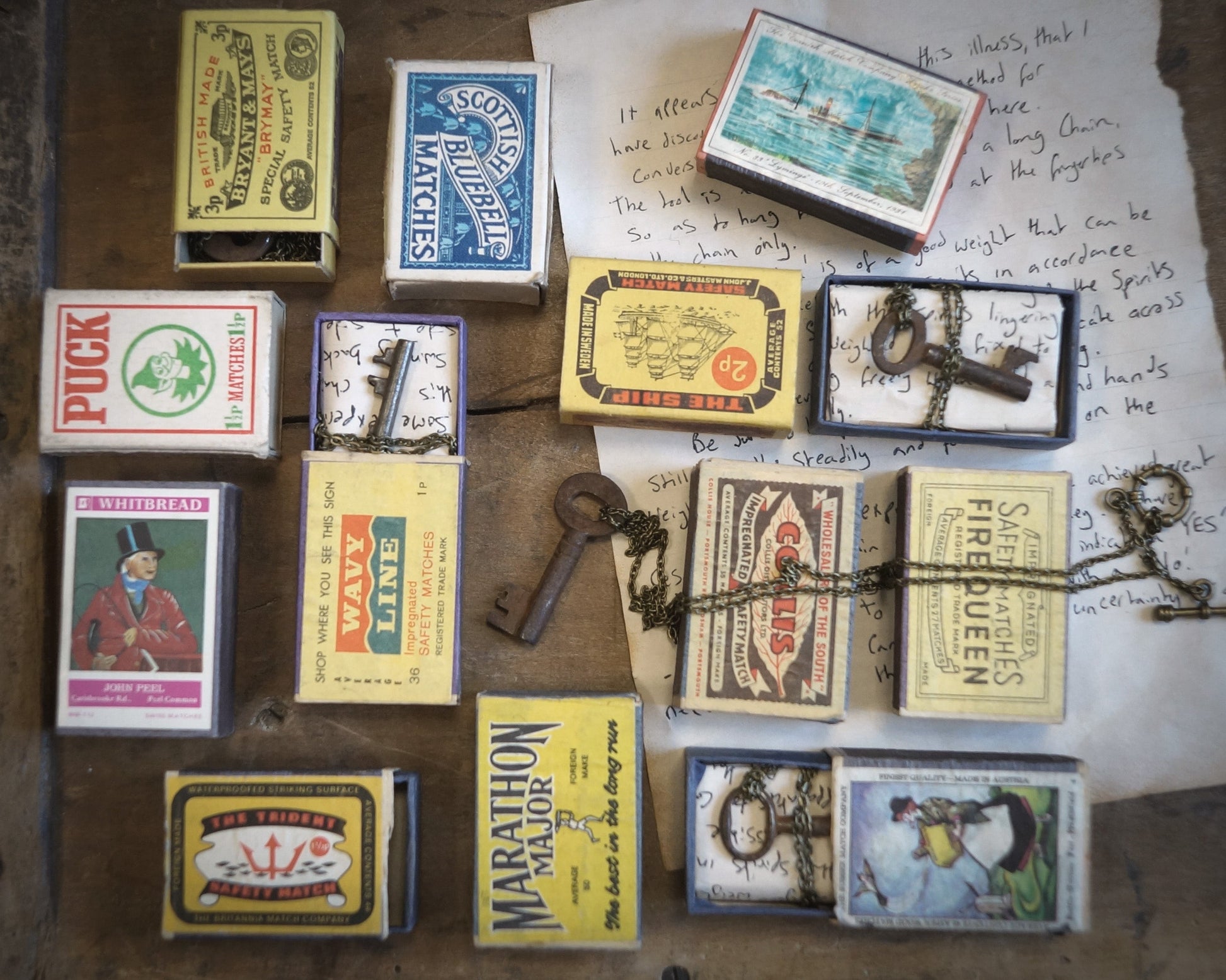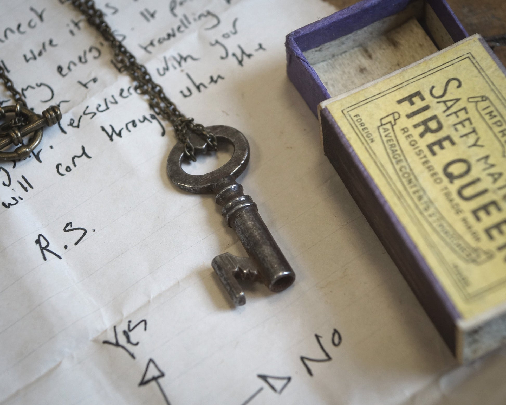 A pendulum made from an old key, wrapped inside a mysterious letter, and hidden inside an old matchbox.