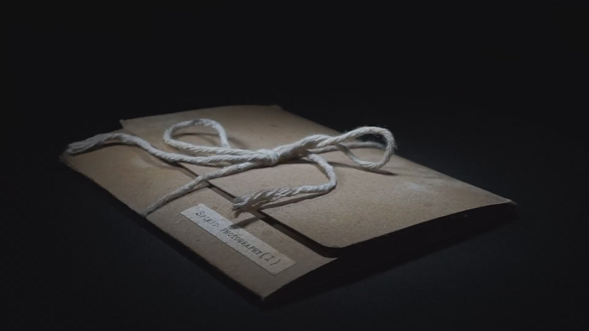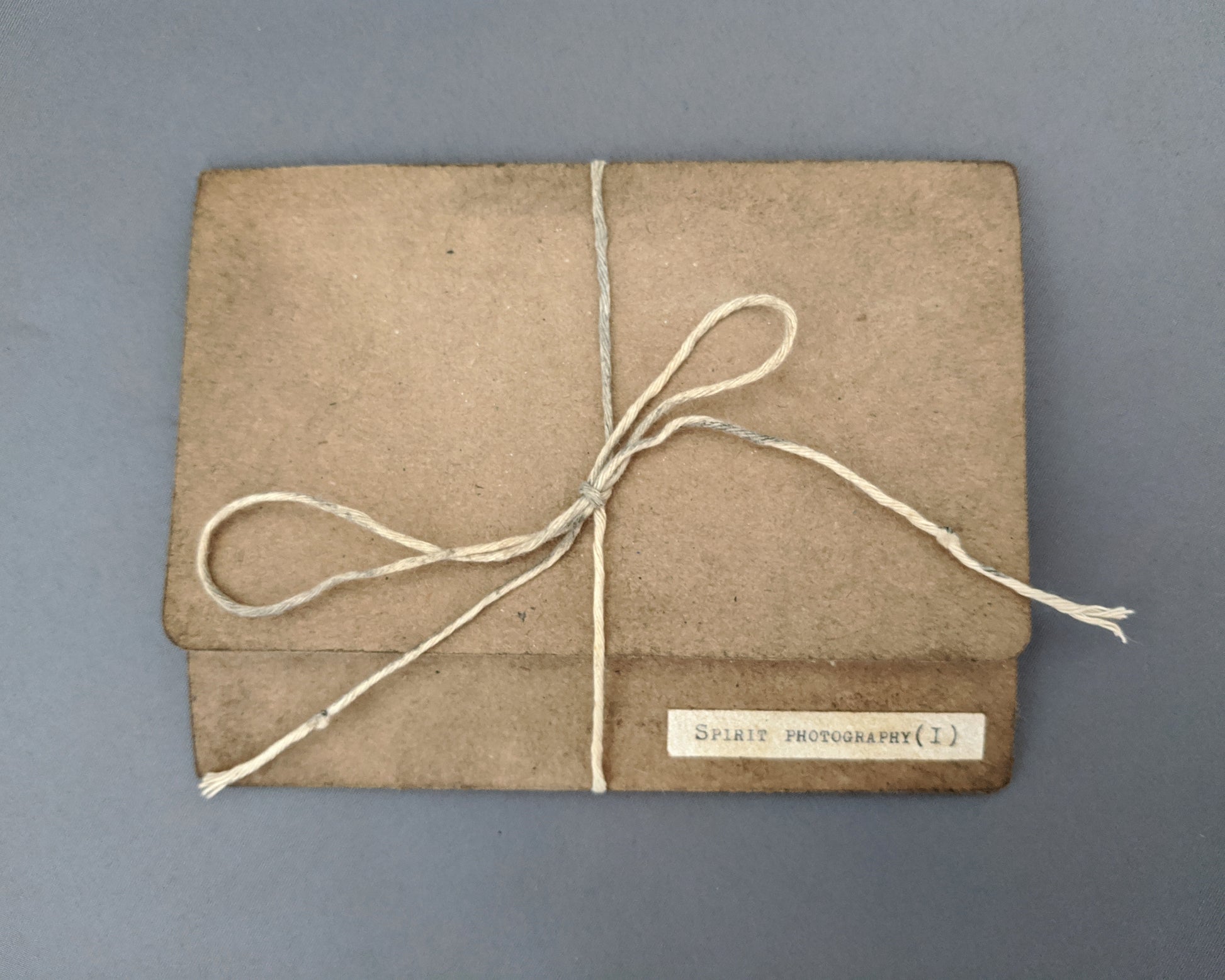 Custom designed brown card envelope with string tie.